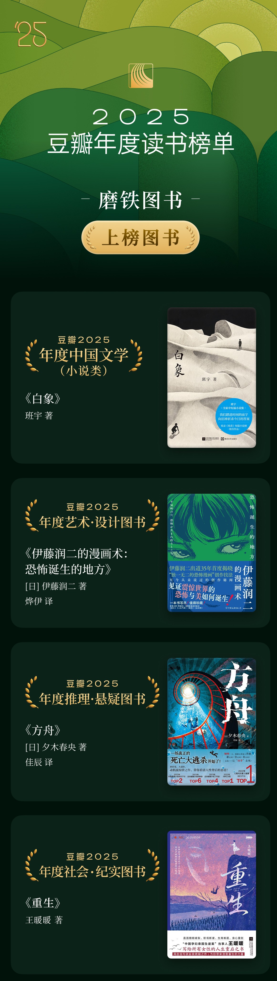 12月18日,豆瓣发布2025年度读书榜单,由磨铁图书出版的《白象》《即使以最微弱的光》《重生》《伊藤润二的漫画术:恐怖诞生的地方》《血孩子》《方舟》《怪屋谜案2》《亲爱的小狗》8本书入选年度读书榜单,中国作家班宇、韩国作家崔恩荣2位作者入选“2025年度作者”。